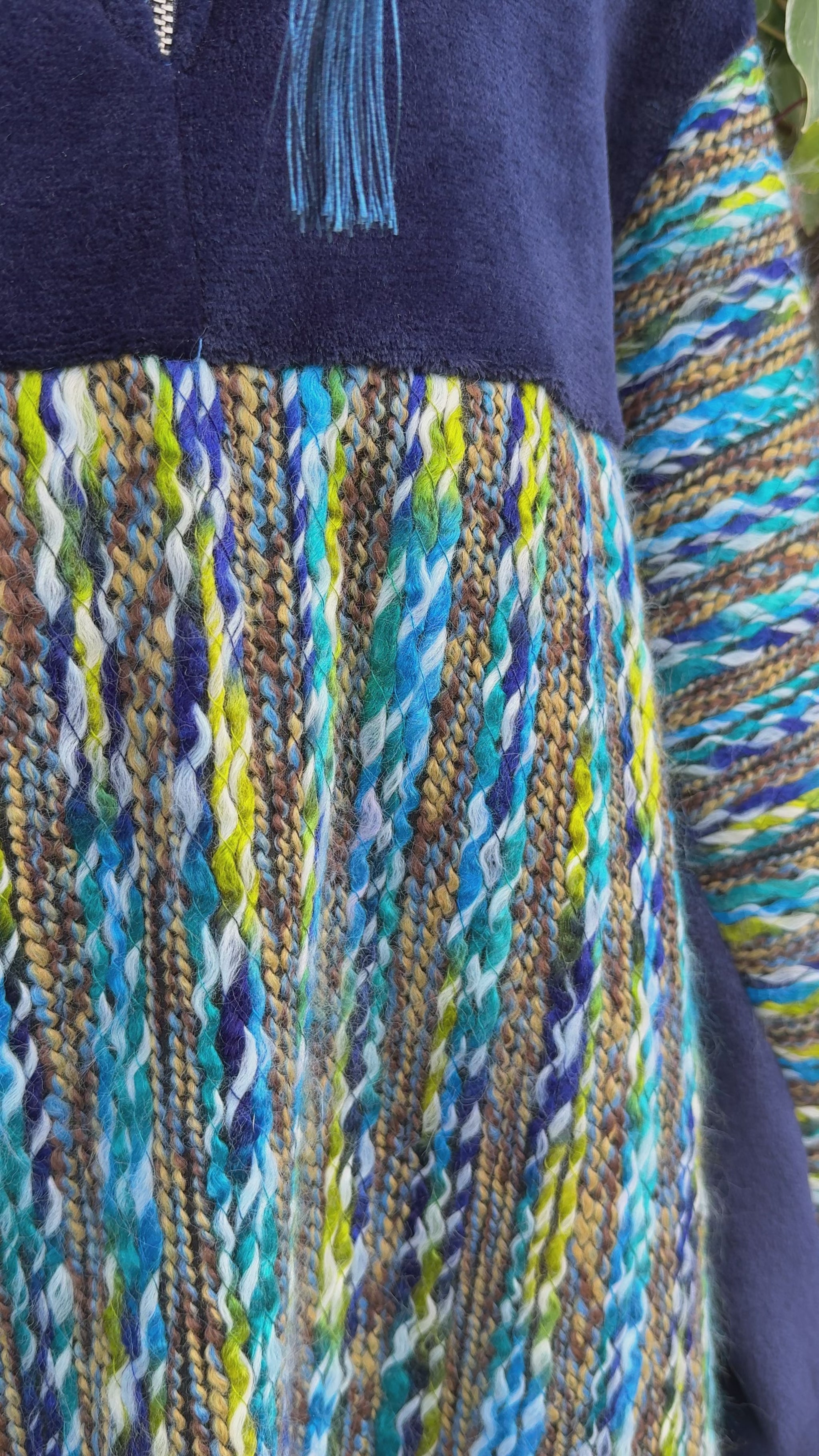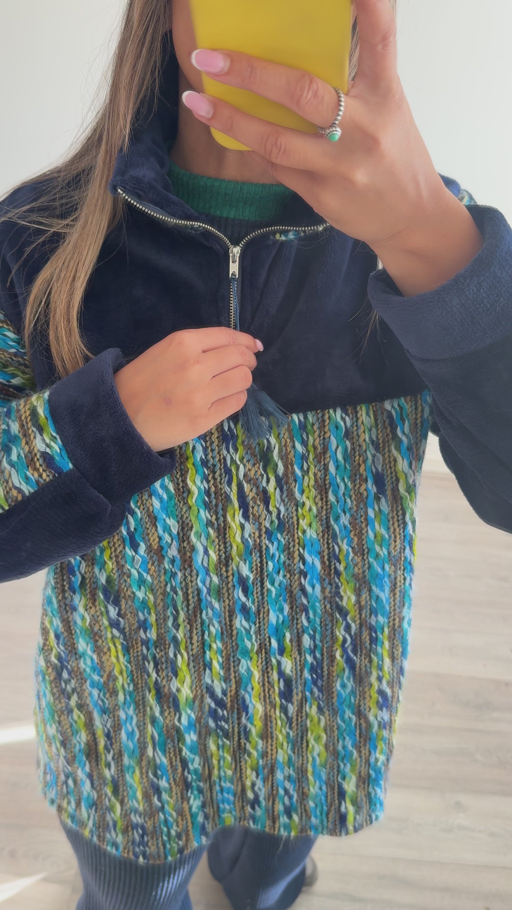 Every panel has been hand-cut and placed with care, bringing together texture and colour in a way that feels truly one of a kind. The half-zip neckline is finished with a tassel pull for a subtle bohemian touch, while the relaxed fit makes it easy to throw on for countryside walks, city coffee runs or late-night festival layers.