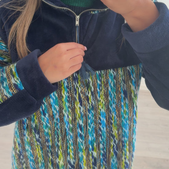 Cut from rich navy cuddle fleece and contrasted with artisan-style knit panels in shades of blue, lime and teal. The Azure Fleece is a statement layer designed for both warmth and individuality.