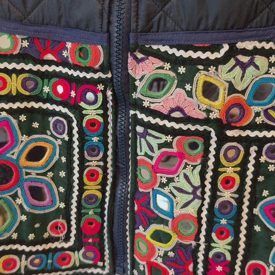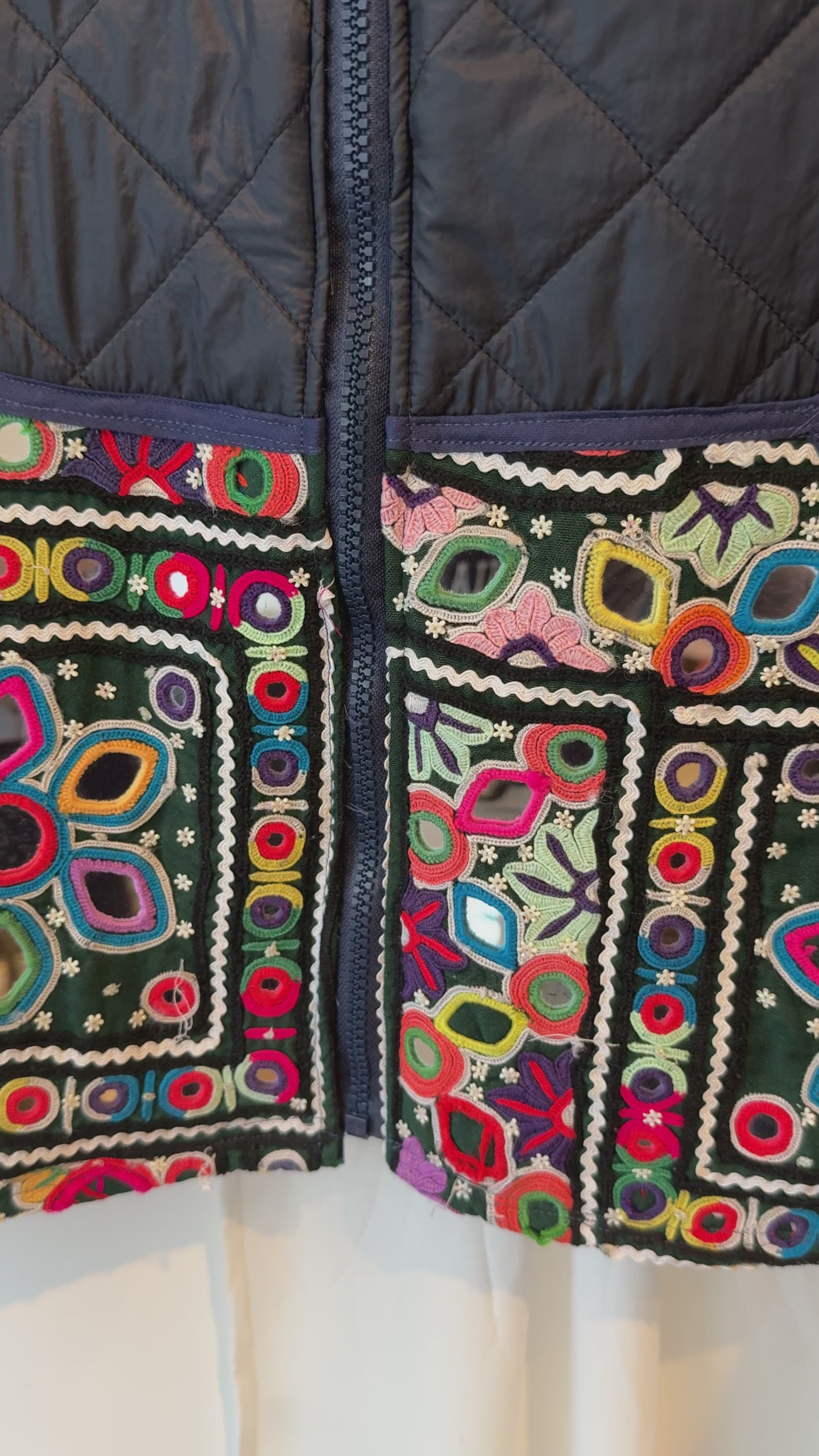Each Kutch Quilt Jacket is a one-of-one creation, hand-cut in our UK studio from vintage Rajasthani choli tops, traditional embroidered blouses once worn and hand sewn by women across the Kutch and Gujarat regions of India. These intricate panels are adorned with real mirrors and hand embroidery, making every piece rich in history and craftsmanship.