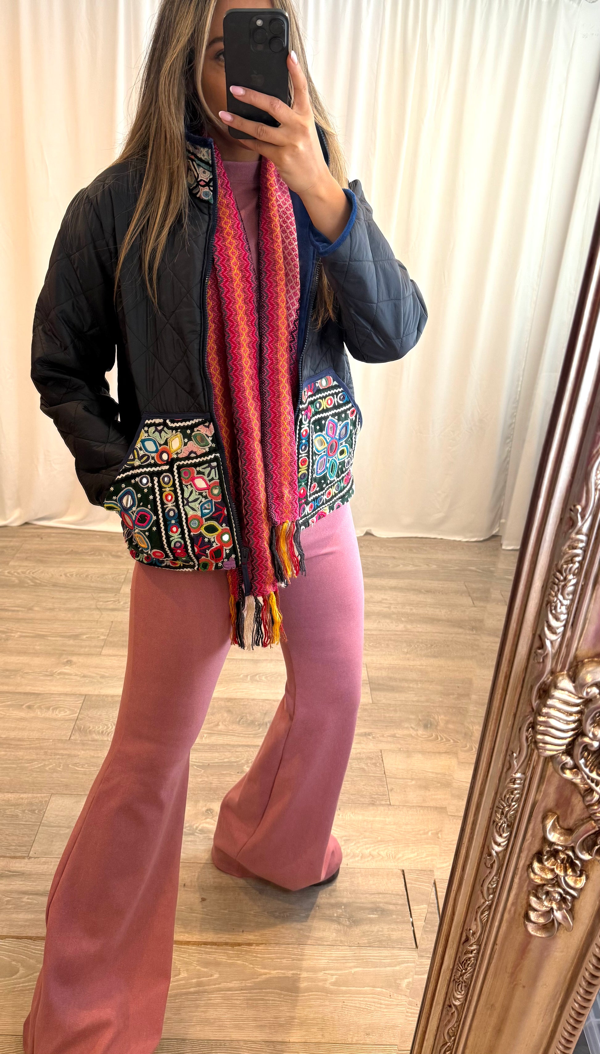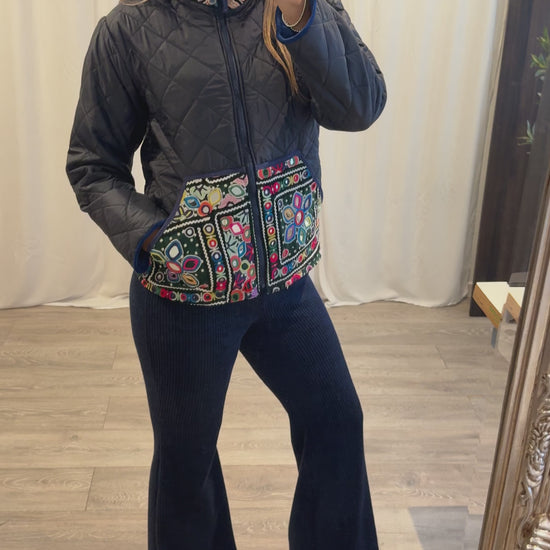 Each Kutch Quilt Jacket is a one-of-one creation, hand-cut in our UK studio from vintage Rajasthani choli tops, traditional embroidered blouses once worn and hand sewn by women across the Kutch and Gujarat regions of India. These intricate panels are adorned with real mirrors and hand embroidery, making every piece rich in history and craftsmanship.