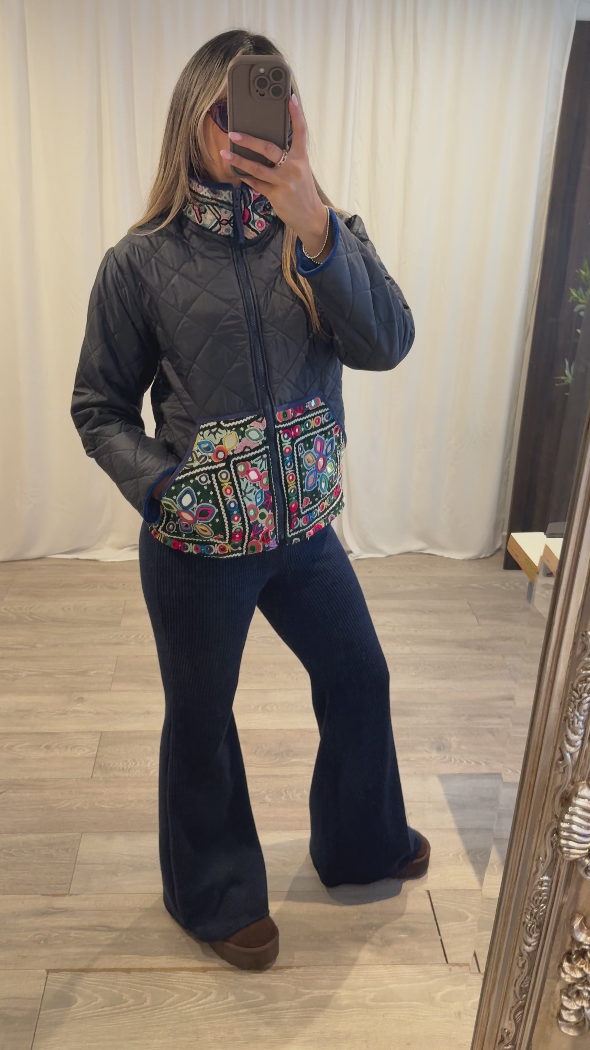 Reimagined into a modern Navy quilted silhouette with fleece lining, a full-zip front, and two front pockets, these jackets blend comfort and heritage with effortless style. Each one takes around 4–5 hours to complete, carefully stitched to preserve the unique charm and imperfections of the original fabric.