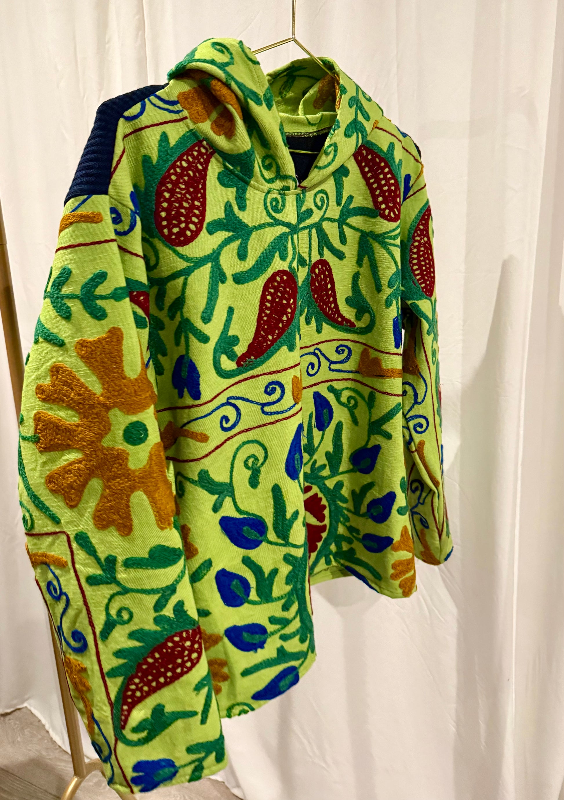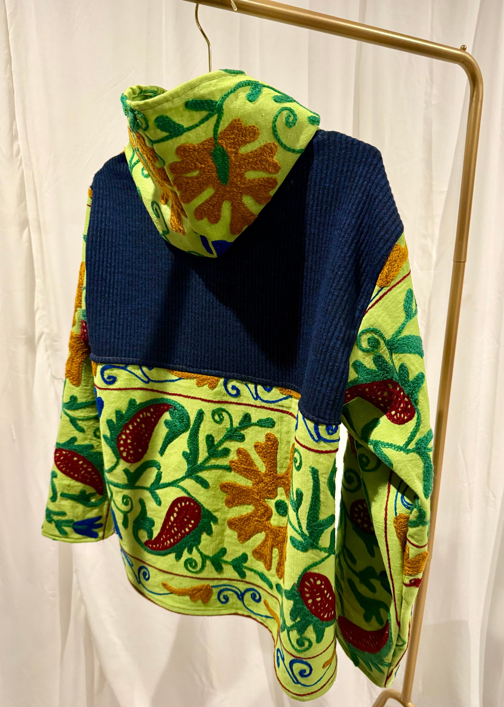 A one-of-a-kind statement layer, reworked from vintage Suzani textiles hand-embroidered by Indian artisans using traditional machine techniques. Each hoodie is cut from lightweight cotton with bold floral and vine motifs, making every piece entirely unique.