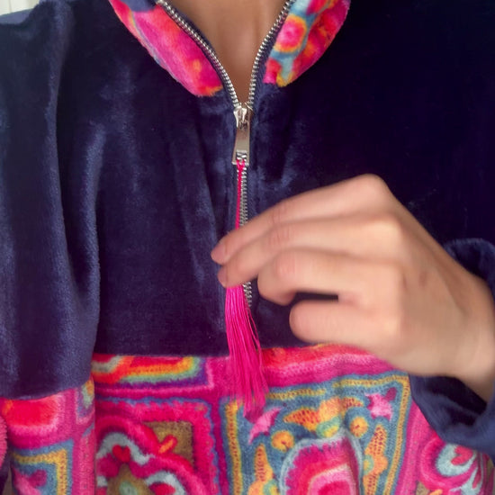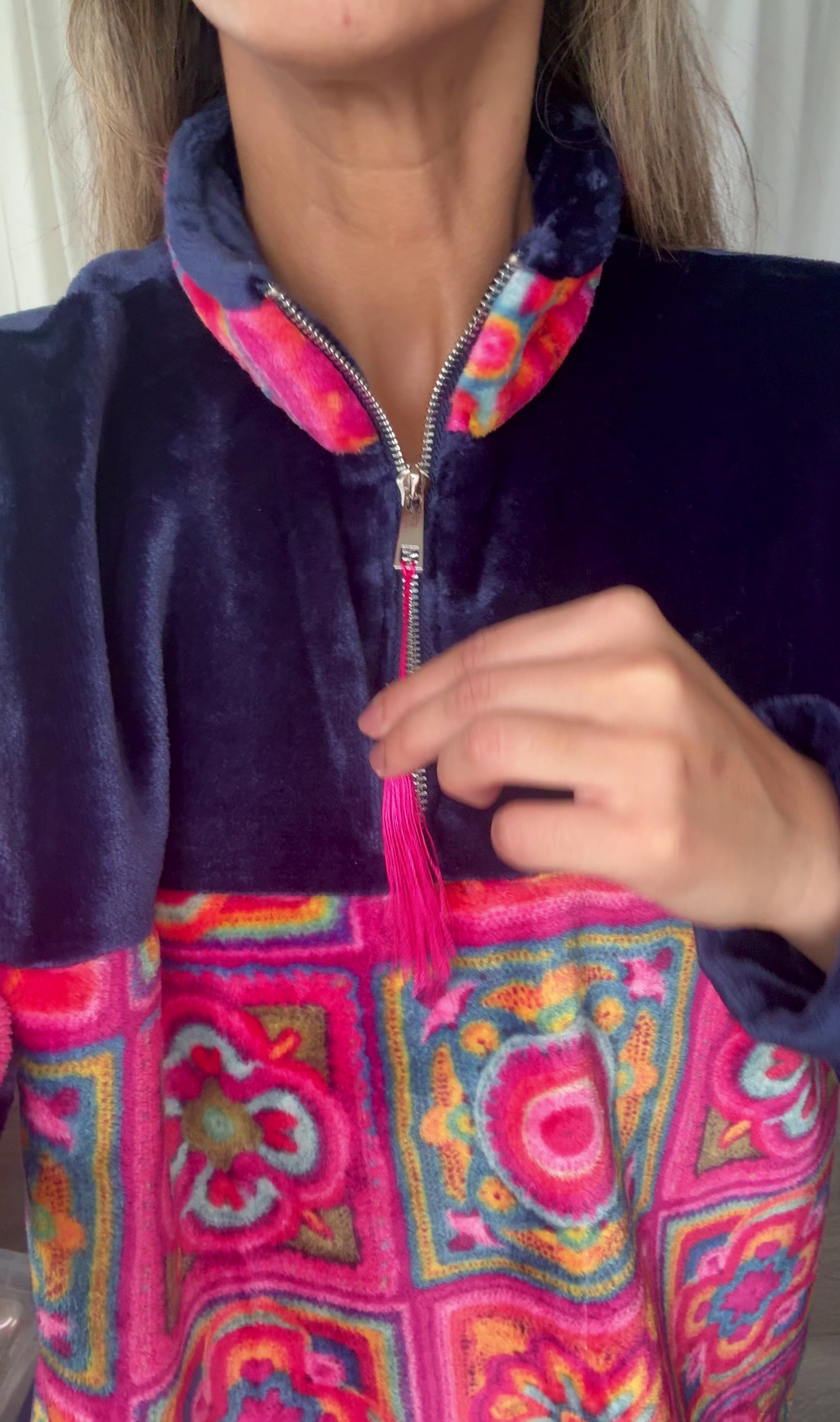 A new take on everyday comfort... Our newest Fleece combines a soft crochet inspired printed fleece with rich navy panels for an elevated, easy-to-wear look. Designed and hand cut in our Liverpool studio, this piece is finished with our signature cozy fleece lining for ultimate warmth and softness & Pink tassel zip detail.