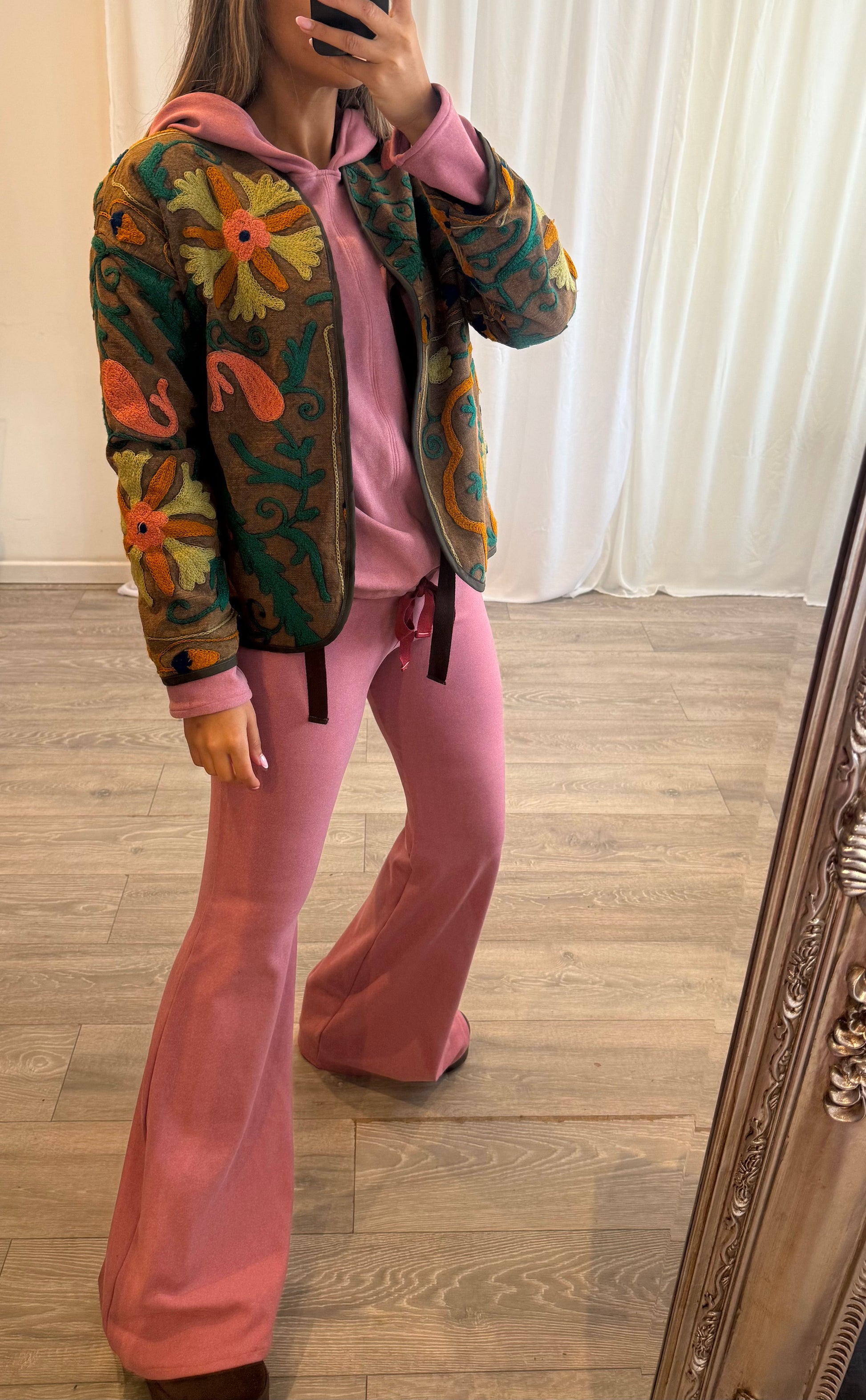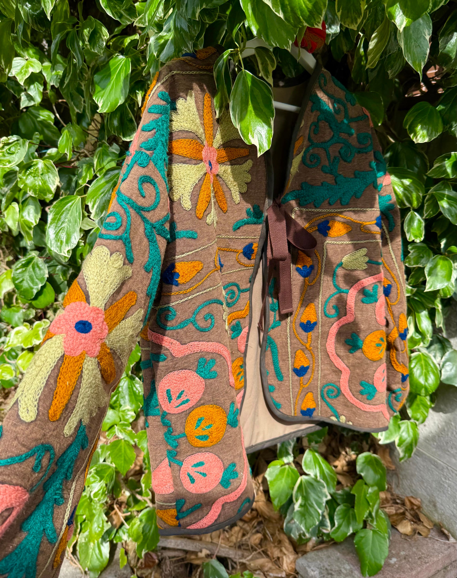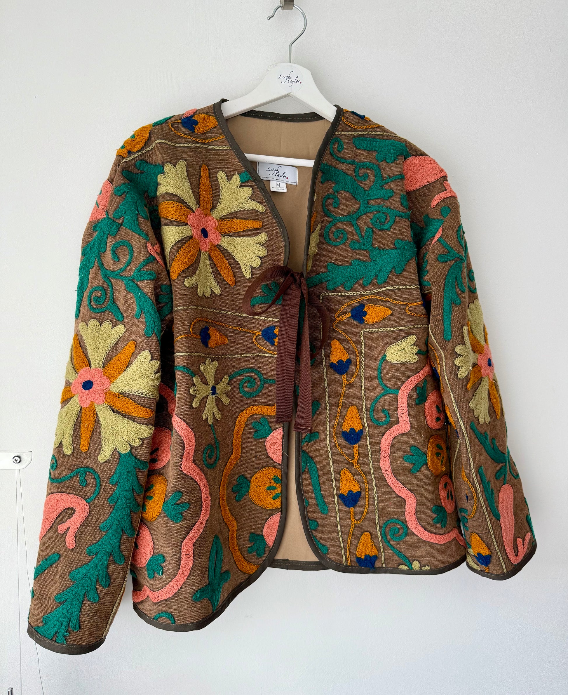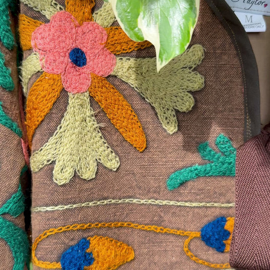 Crafted from rare Suzani fabric, each of these one-of-a-kind jackets tells a story of heritage and artistry. The embroidery is stitched by hand on the machine called Suzani, an intricate process passed down through generations making every piece a wearable work of art.